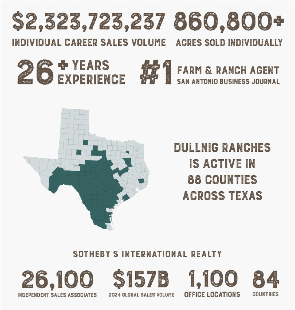 Dullnig Ranches stands as the premier destination for buyers and sellers seeking the best ranch broker in Texas. With over 26 years of dedicated experience in Texas land and ranch sales, we’ve established ourselves as the #1 Farm & Ranch Agent, as recognized by the San Antonio Business Journal. Our deep-rooted knowledge spans a wide array of properties, from South Texas ranches for sale to Hill Country ranches for sale, including Texas hunting ranches for sale, luxury ranches for sale in Texas, and working cattle ranches for sale in Texas. Led by acclaimed broker Robert Dullnig and a team of seasoned agents, we curate exceptional listings that capture the essence of Texas ranch real estate—whether you’re after live water ranches for sale in Texas or expansive recreational ranches.